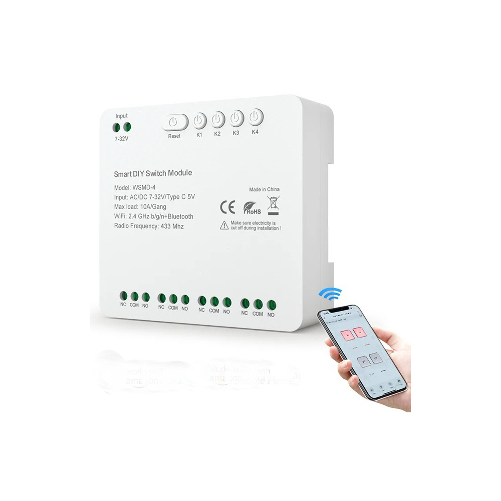WIFI smart switch, četvorokanalni, radni napon 220V, izlaz – suvi kontakti relea NO/NC/COM 2.5A po kanalu, WiFi 802.11 b/g/n 2.4GHz, IP20 dimenzije 84mmx79mmx29mm, radna temperatura -10°C ~ +40°C, koristi aplikaciju Smart Life.